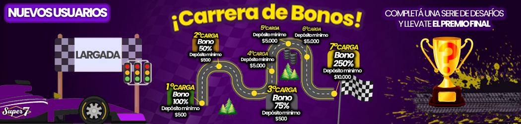 Con tu primera carga ya participás en la carrera! Segui el desafío para llevarte todos los bonos hasta el premio final! Pero ojo, ¡asegurate de cumplir los montos mínimos en cada carga para seguir en carrera!
